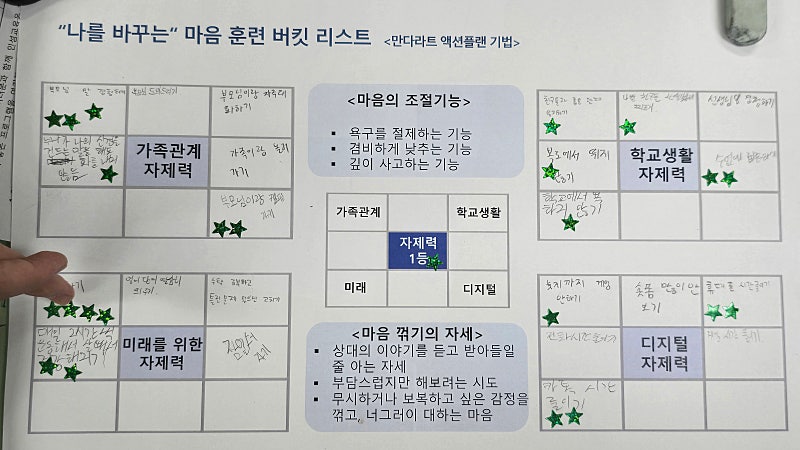 ‘만다라트 액션 플랜 기법’을 사용해 생활 속에서 자제력을 키울 구체적인 방법을 고민합니다.